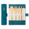 BambawA stylish cutlery set in a Lagoon cotton roll up pouch to keep your utensils clean and safe whilst out and about or just in your office draw. Each item is beautifully made from one piece of organic bamboo with a natural finish, this is the perfect travel utensil set which is great for camping, festivals or just keeping in your day bag! Please note these have been further reduced due not perfect inner pouch.