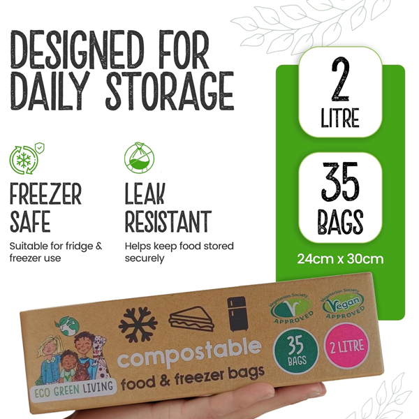 Eco Green LivingCertified 100% compostable these food and freezer bags are made from completely natural plant based and renewable resources. The strong transparent bags are quick and easy to see the contents with convenient tie handles. Please note these bags are split a third of the way down to use as a tie handle. Please be delicate when removing the bag from the roll.