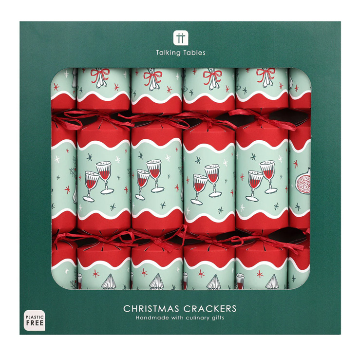 Bring timeless style to your festive table with these Bon Noel Green Christmas Crackers. Featuring a sage green design with delicate Talking Tables icons, each cracker is handmade in South Africa and finished with care. Inside, guests will discover a classic paper hat, a festive joke and a culinary-inspired gift – the perfect recipe for Christmas dining done beautifully.