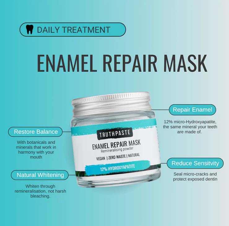 truthpasteGoodbye Sensitivity, Hello Stronger Teeth. Formulated with 12% micro-Hydroxyapatite, this daily intensive treatment delivers professional-level enamel repair. Hydroxyapatite works biomimetically to rebuild microscopic defects in enamel, restoring mineral density and protecting teeth against acid erosion. Suitable for those with sensitivity, weakened enamel, or early signs of demineralisation, the Enamel Repair Mask brings dental science into your daily care routine.