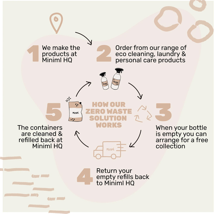 You can return either 4 x 5 litre refill containers or 4 x 1 litre refill containers. Scan the QR code on 5L containers and enter any 4 digits to print a label or book Royal Mail courier collection. You will need a box and the label.  You must have at least 4 empty 5l containers for the return.  Once these have been returned to Miniml they are cleaned and re used again and again.