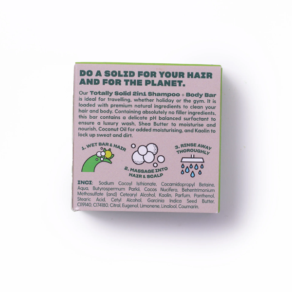 Our Totally Solid 2in1 Shampoo and Body Bar is ideal for travelling, whether holiday or the gym. It is loaded with premium natural ingredients to clean your hair and body.. Containing absolutely no filler ingredients, this bar contains a delicate pH balanced surfactant to ensure a luxury wash, Shea Butter to moisturise and nourish, Coconut Oil for added moisturising, and Kaolin to lock up swear and dirt.