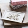 Elegant porcelain soap dish featuring a raised olive leaf design to help your natural soap dry between use and last longer.