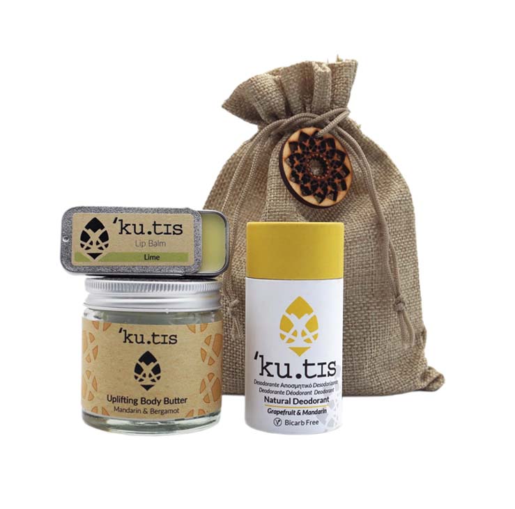 'Ku.tisThis little bundle of Citrus scented products makes the perfect all natural skincare gift set. Inside the ready to gift hessian drawstring pouch you will find a Grapefruit & Mandarin Bicarb Free Deodorant, a Lime Lip Balm and a jar of Uplifting Mandarin & Bergamot Body Butter.