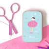 Wooden peg doll, wool, pom pom makers, watercolour pencils, wooden needle, glue, mini paintbrush, keepsake tin & label
