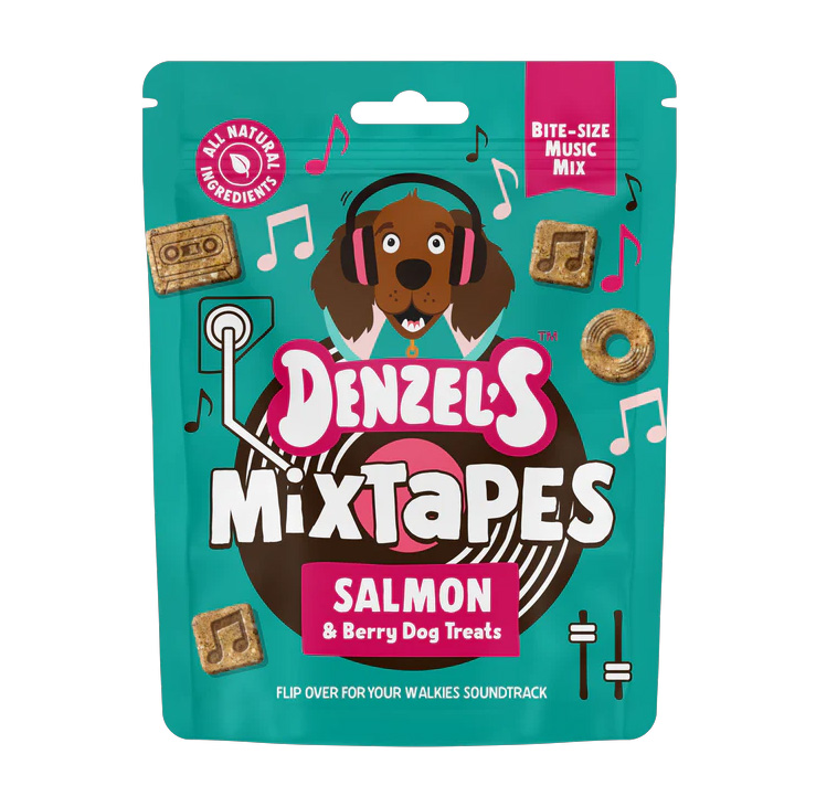 Denzel'sTreat your dog to Denzel’s Mixtapes: bite-sized music mix treats shaped like vinyls and music notes. Made with tasty salmon and berries, our high quality, soft-baked treats are all natural, low calorie and perfect for training. Flip over the pack and scan the QR code to access your latest dog walking playlist. Because treating should be fun for you and fun for them.