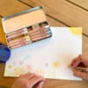 Each tin contains 10 watercolour pencils. There are 9 delicate pastel shades, including a mix of soft pink, lilac, peach, and light blue, alongside a white pencil for highlighting. The set also includes a sharpener and paintbrush.