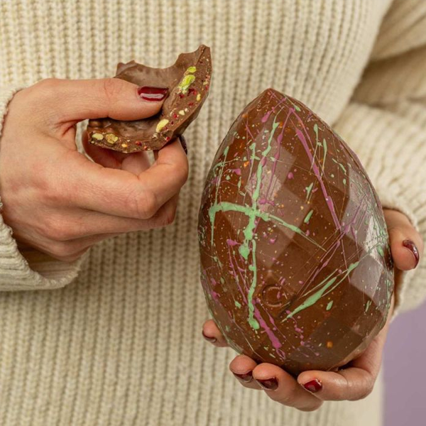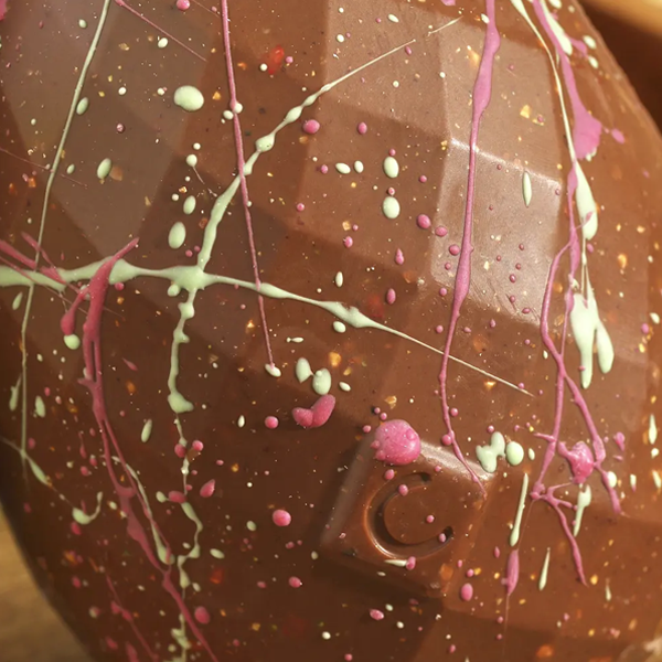 Each Easter egg is handmade in Chococo’s Dorset kitchen and meticulously hand-decorated with cocoa butter spatters in a vibrant, strong pink tone. Only natural colourings are used, and every egg is packaged in 100% plastic-free, fully recyclable cardboard.
