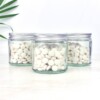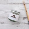 Reusable and refillable glass jar with metal lid. Label is biodegradable. Plastic EPE lid liner.