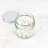 Reusable and refillable glass jar with metal lid. Label is biodegradable. Plastic EPE lid liner.